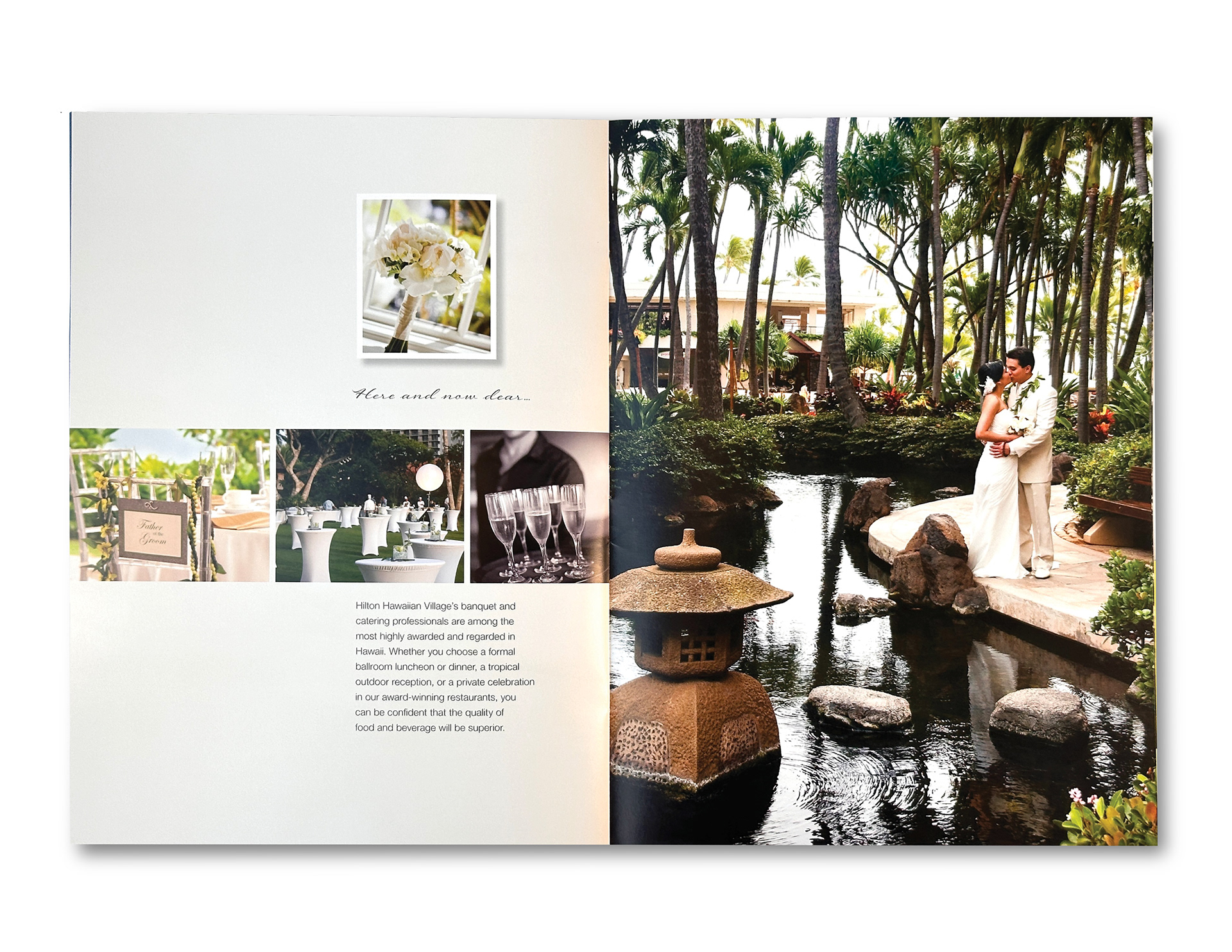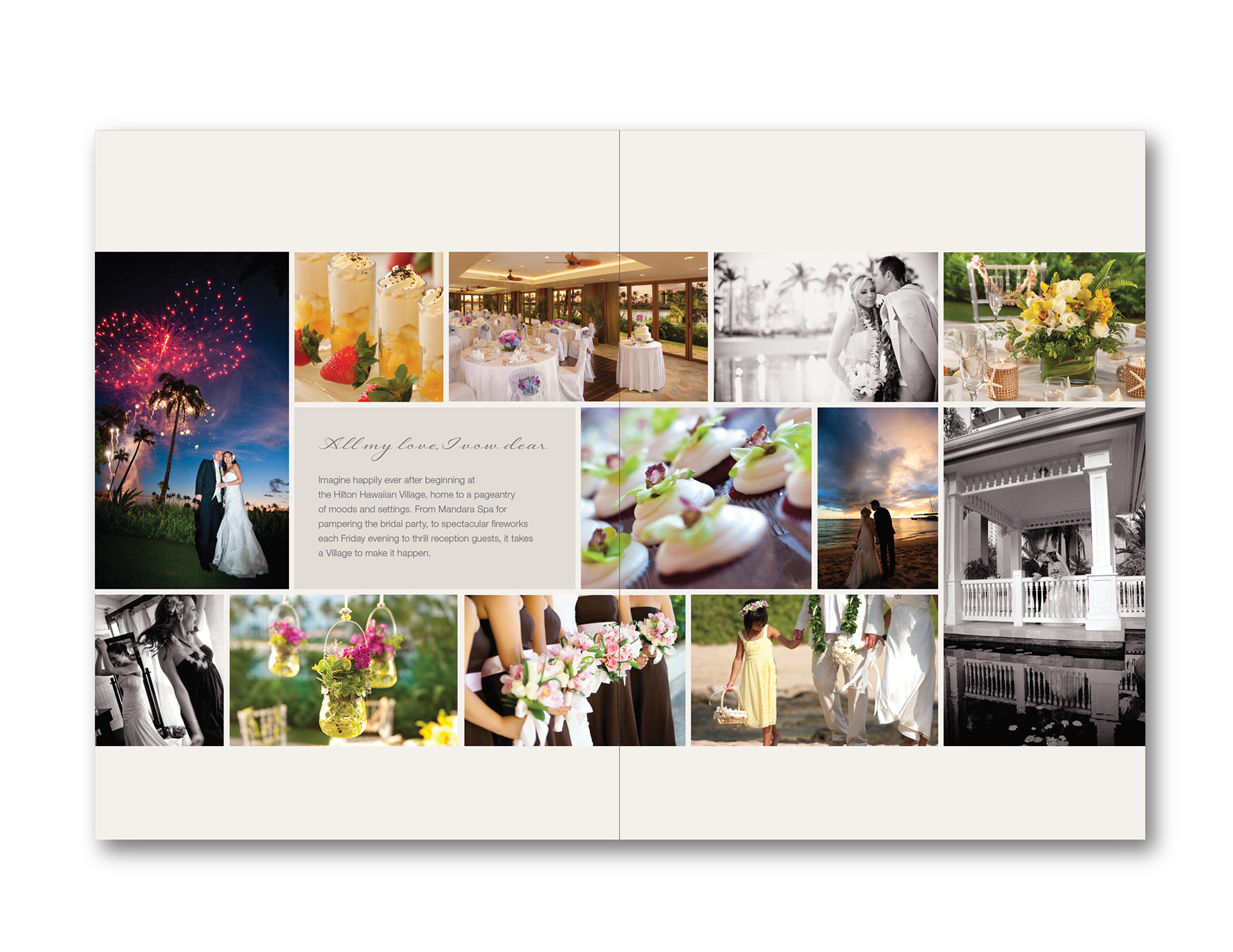 Hilton Hawaiian Villageʻs Wedding Brochure elegantly intertwines stunning photography with the melodic prose of the Hawaiian Wedding Song, creating a poetic celebration of love. The brochure showcases sophisticated nuptials set in breathtaking surroundings, with the natural beauty of one of the world's most beautiful beaches as the backdrop. Highlighting amazing food crafted by expert chefs, it offers a glimpse into the exquisite culinary experiences available. The superb ballrooms and luxurious suites provide a perfect setting for both grand celebrations and intimate gatherings. This brochure invites you to envision an unforgettable wedding day in paradise, where every detail reflects elegance and romance. Client: HILTON HAWAIIAN VILLAGE WAIKIKI BEACH RESORT Purpose: SHOWCASING THE PROPERTY, SERVICES AND FOOD FOR WEDDING EVENTS Location: HILTON HAWAIIAN VILLAGE IN HONOLULU, HAWAII Account Director & Manager: CARRIE WEDEMEYER Designer: LORI NUHA Photography: JULIA SEIBER, DANA EDMUNDS, DANA MARTEL, NINETEEN OWLS Copywriter: SUSAN SUNDERLAND Printer: HONBLUE
